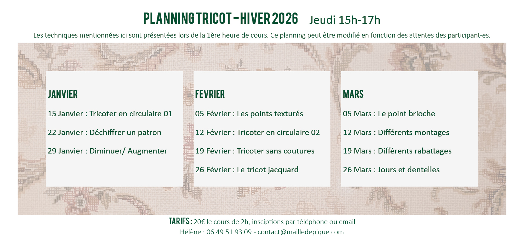 Les cours durent 2 heures : découvertes des techniques de base nécessaires à la réalisation de premiers projets simples en crochet ou en tricot. Évolution progressive des techniques et des compétences selon les attentes des participant-es. En petit groupe (5 personnes maxi).