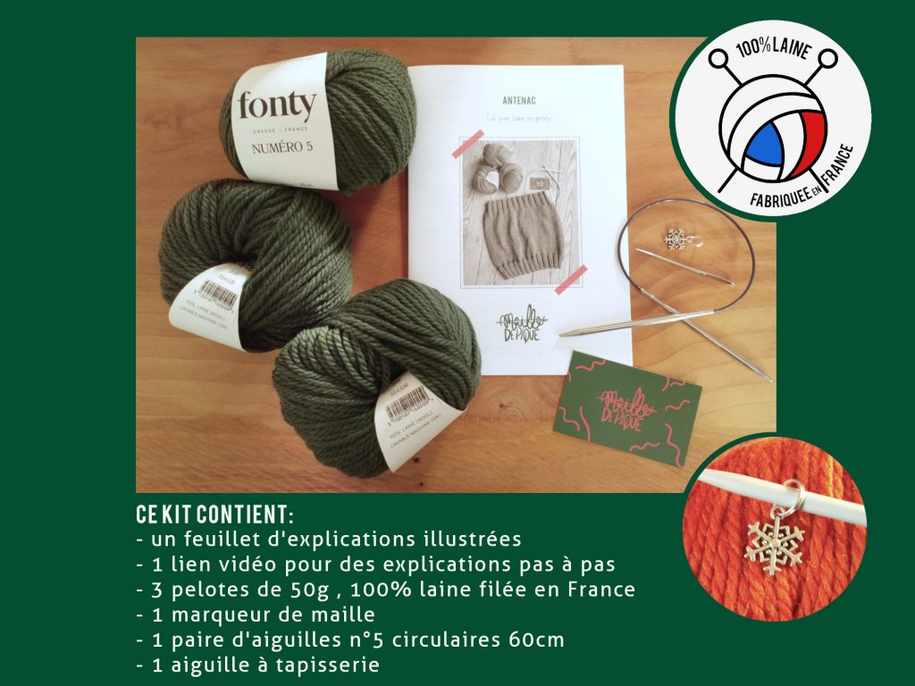 - Il est proposé en kit (avec ou sans matériel) 100% laine et filé en France