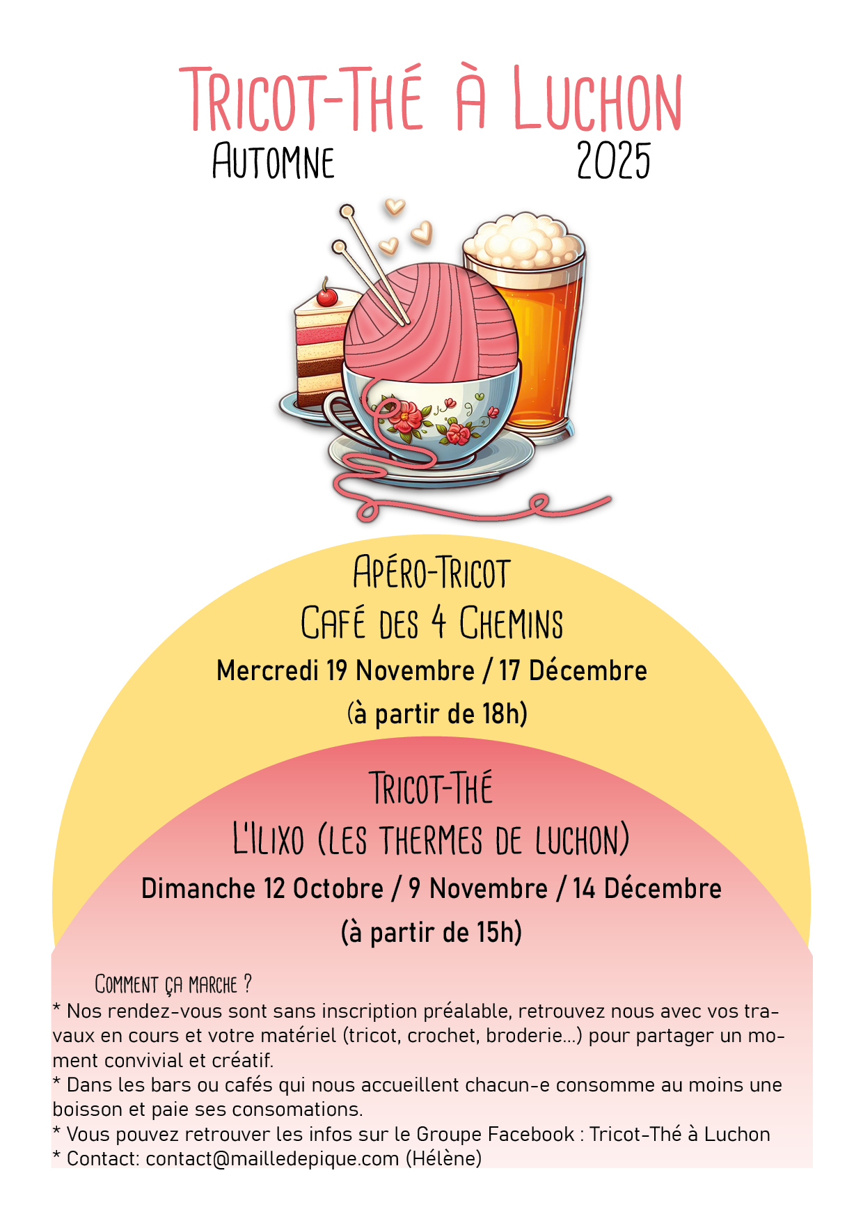 Luchon est une petite ville de montagne au cœur des Pyrénées. Dans cette citée touristique nichée au cœur des plus grands sommets pyrénéens, nous vivons au rythme des saisons. C’est ici que notre club de tricot, connu des habitants comme » le Groupe du Tricot-Thé » a vu le jour en 2012.