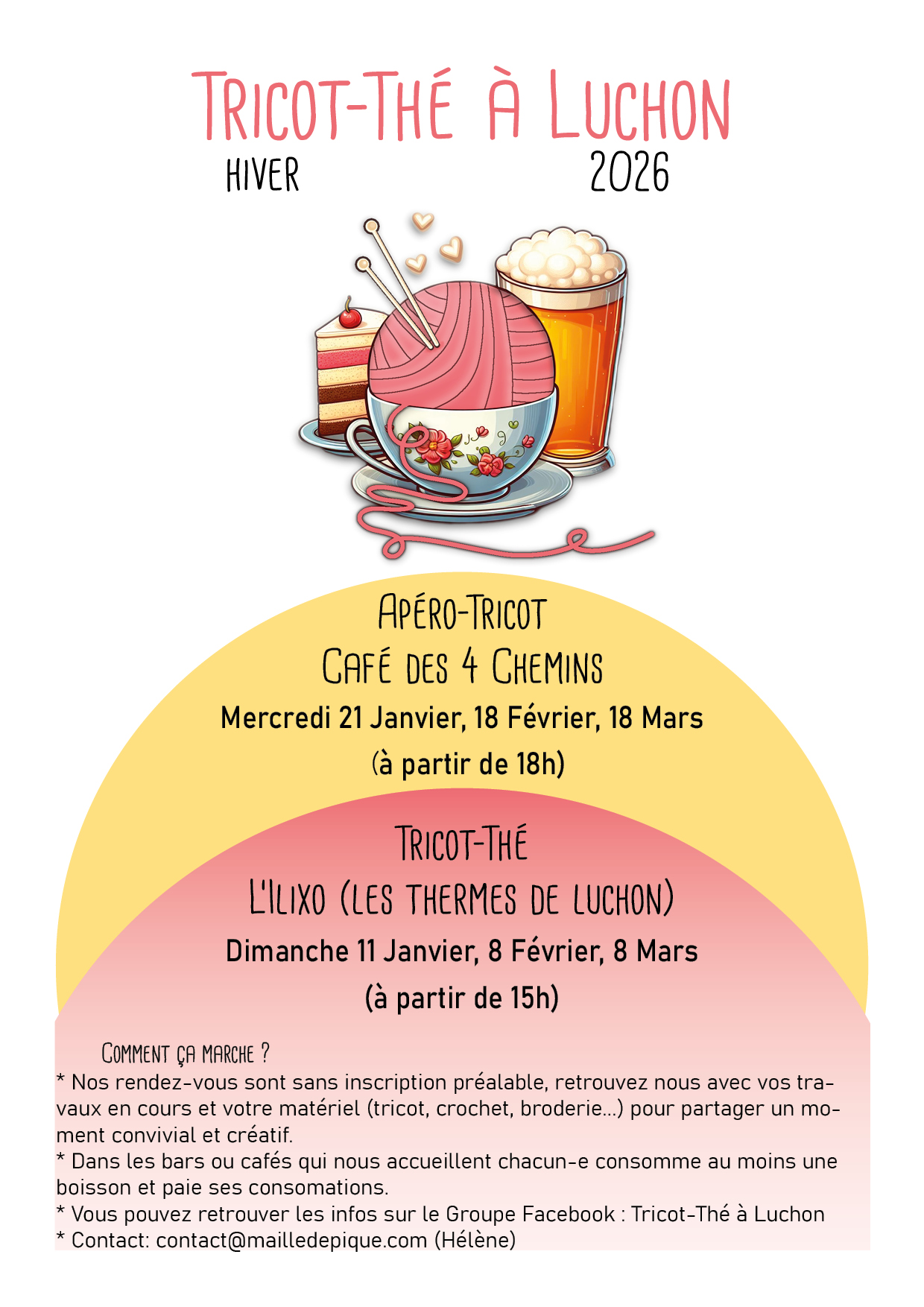 Luchon est une petite ville de montagne au cœur des Pyrénées. Dans cette citée touristique nichée au cœur des plus grands sommets pyrénéens, nous vivons au rythme des saisons. C’est ici que notre club de tricot, connu des habitants comme » le Groupe du Tricot-Thé » a vu le jour en 2012.